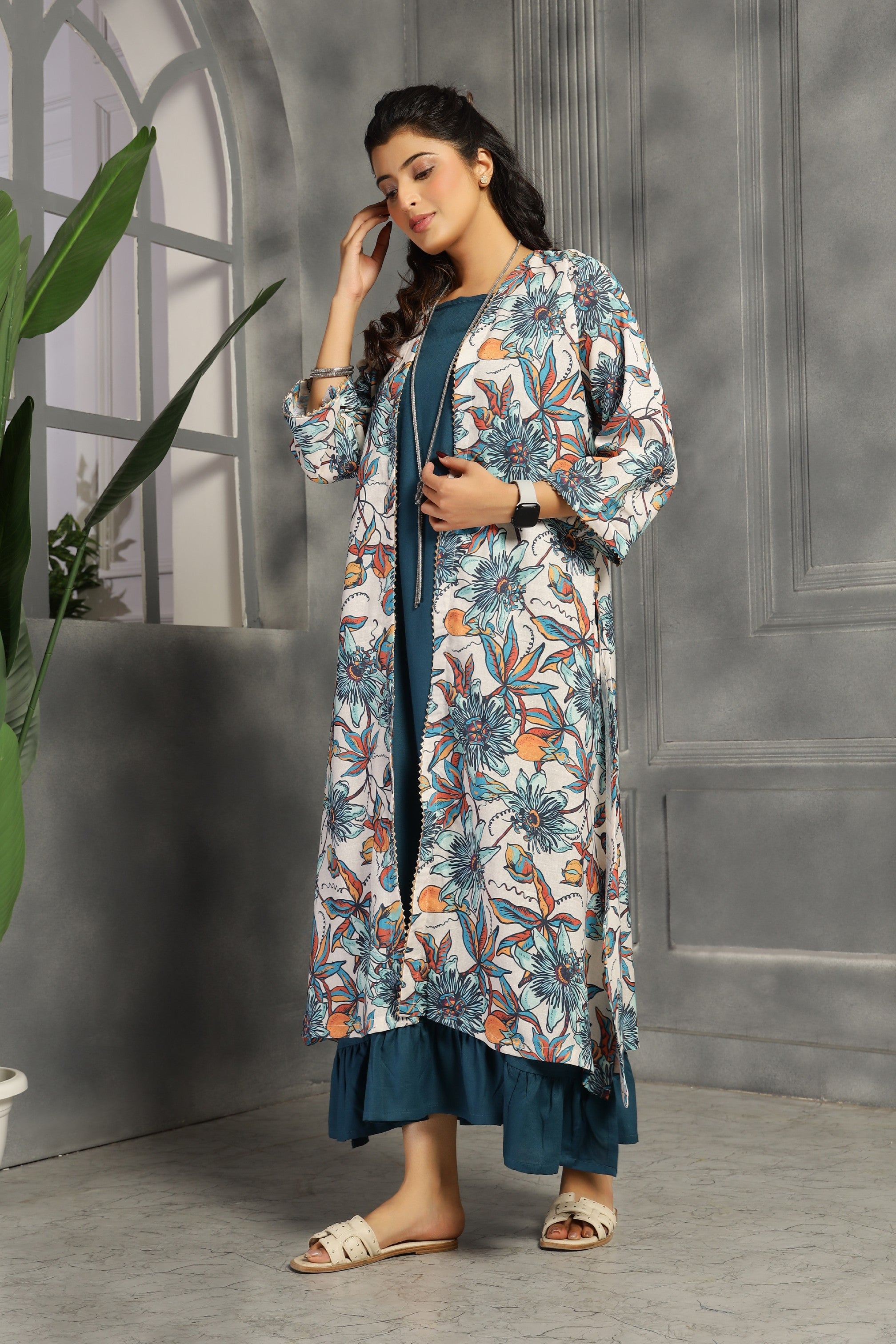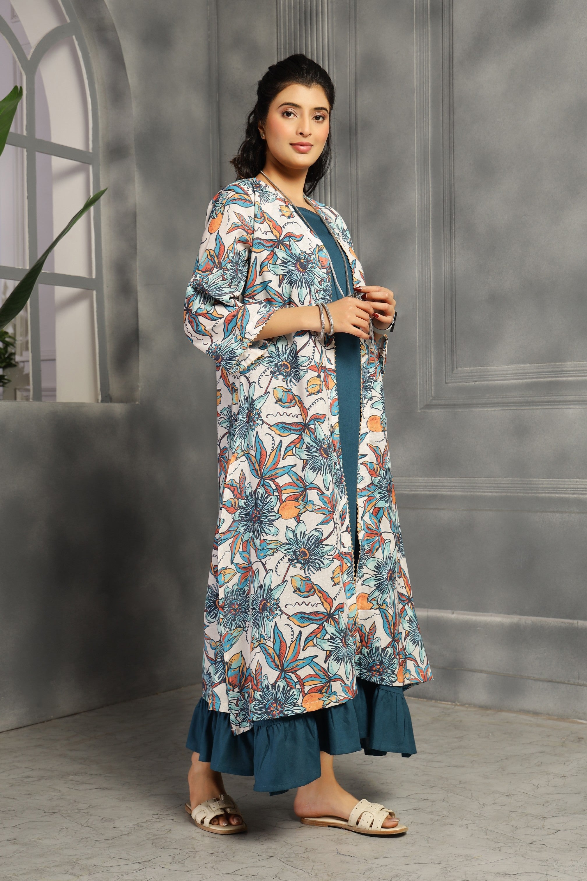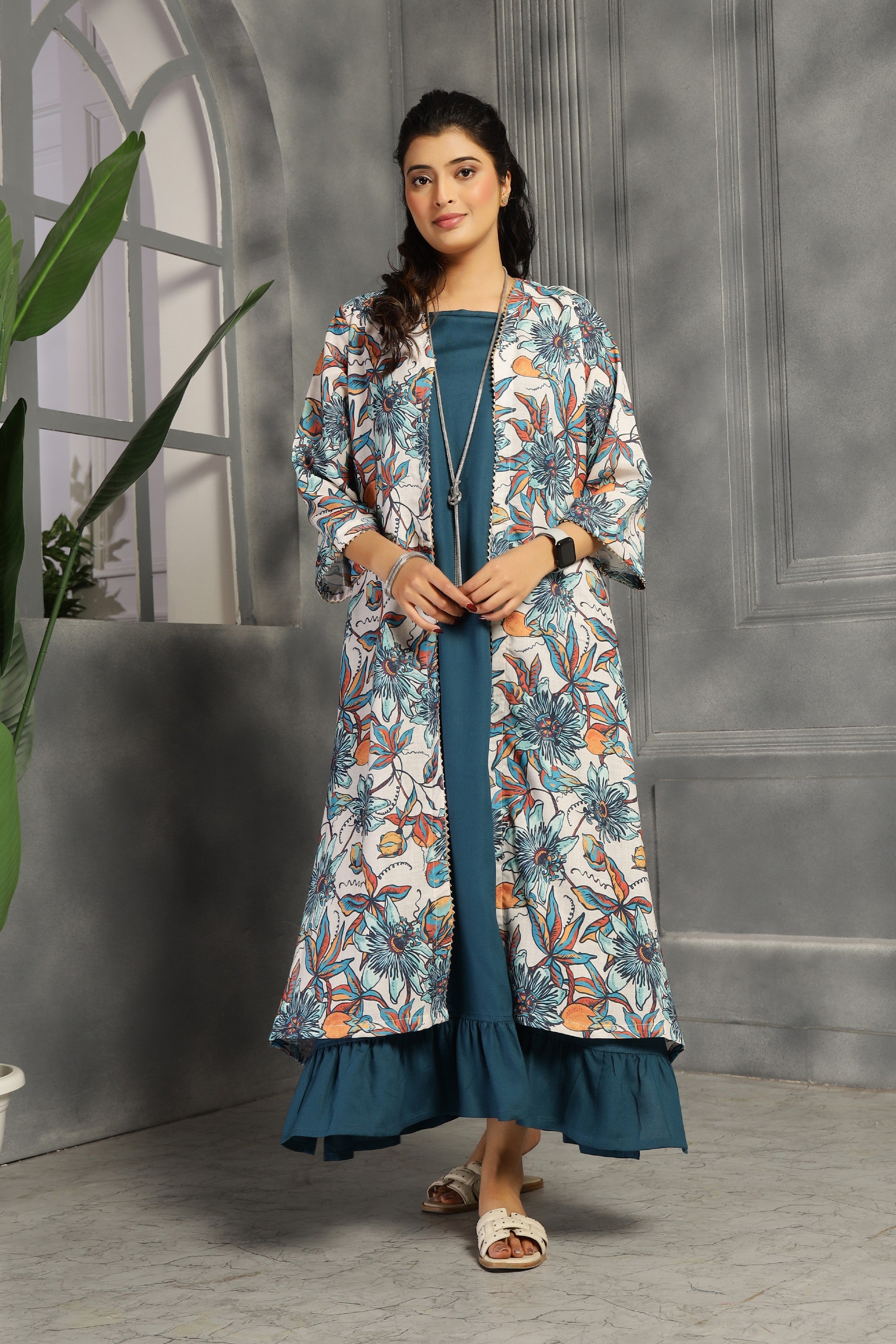 This two-piece ensemble features a spaghetti dress with a relaxed fit and convenient pockets, providing both comfort and functionality. The accompanying shrug serves as a versatile kurti, allowing you to customize your look effortlessly. Crafted in a striking big floral teal blue print, this set combines style and practicality for everyday wear.