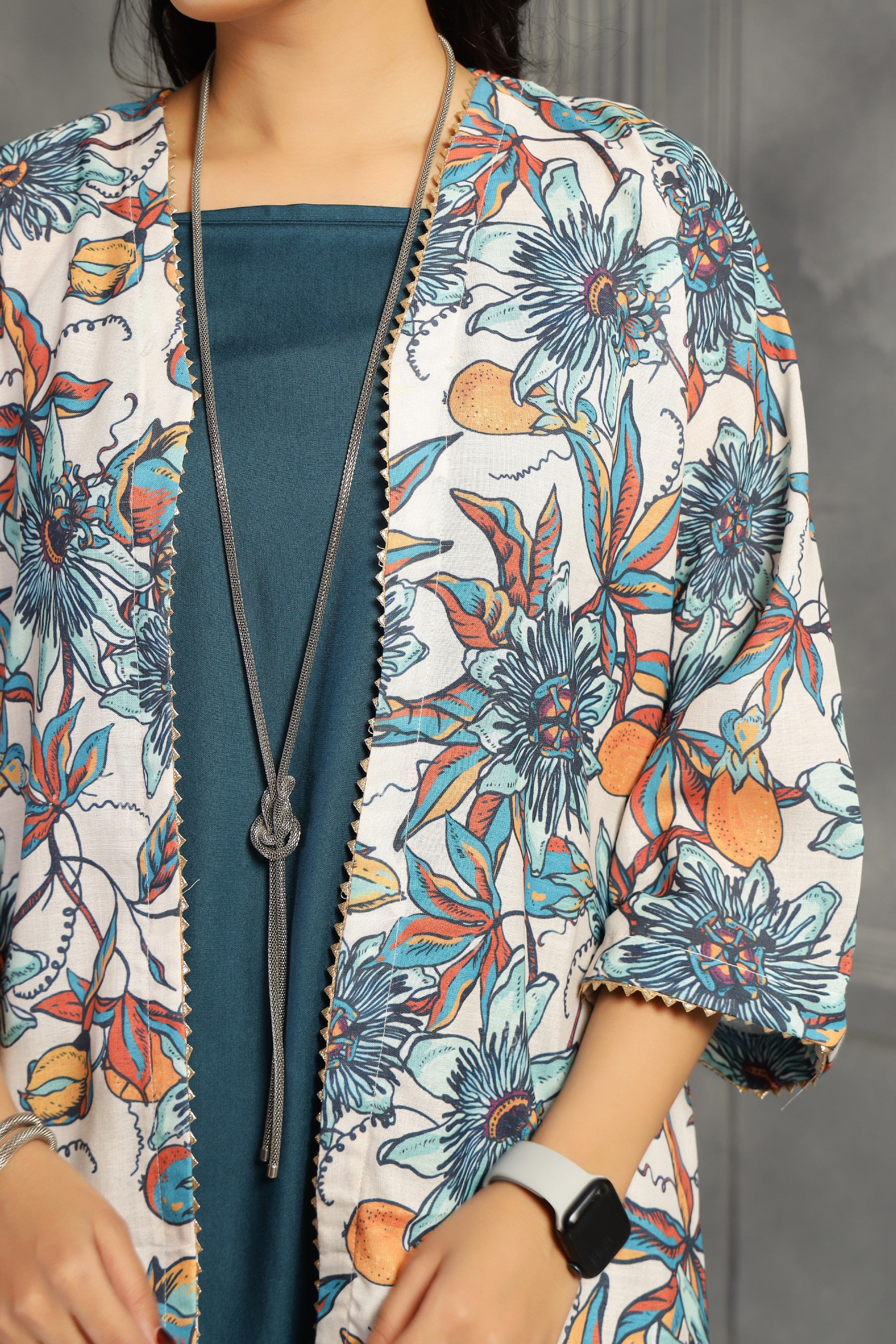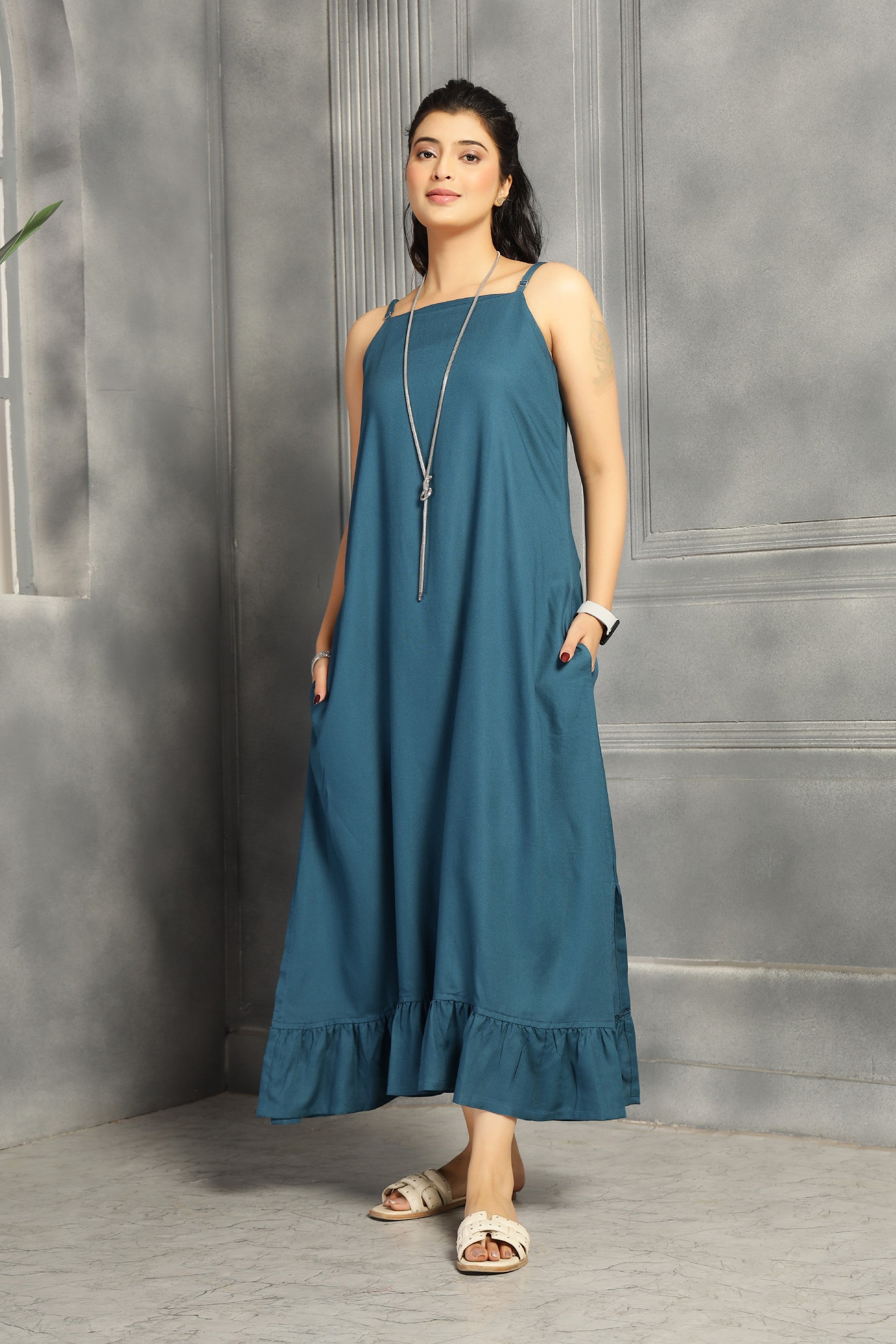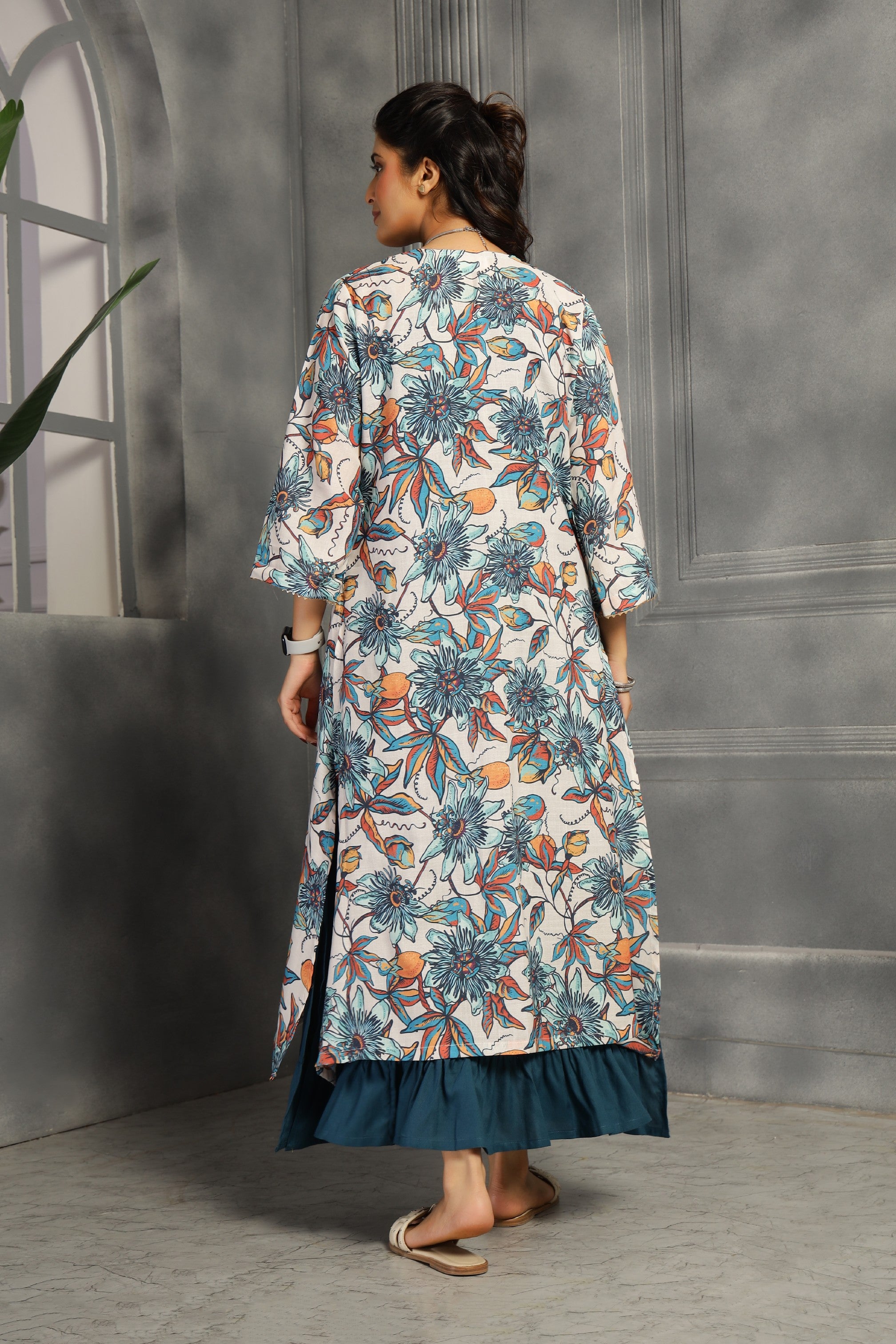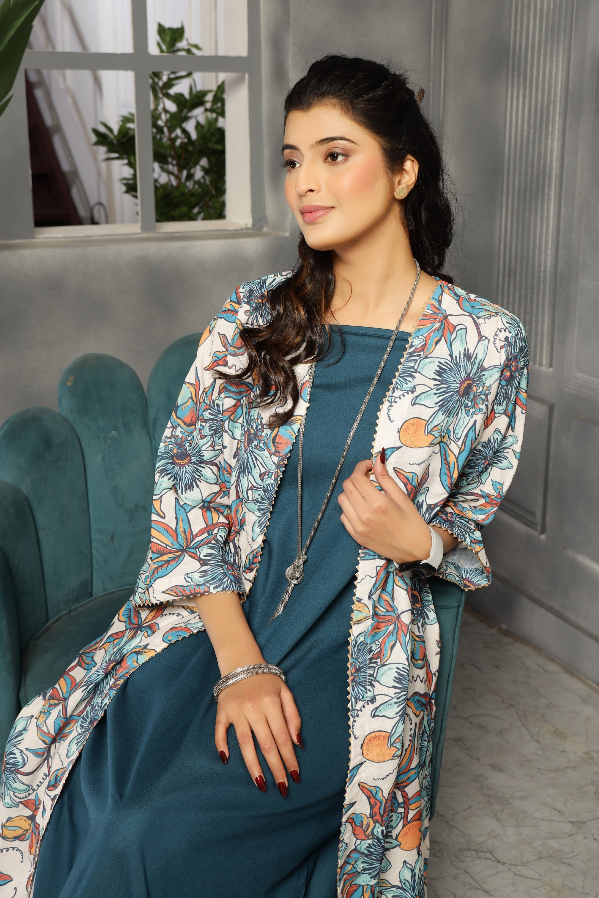 This two-piece ensemble features a spaghetti dress with a relaxed fit and convenient pockets, providing both comfort and functionality. The accompanying shrug serves as a versatile kurti, allowing you to customize your look effortlessly. Crafted in a striking big floral teal blue print, this set combines style and practicality for everyday wear.