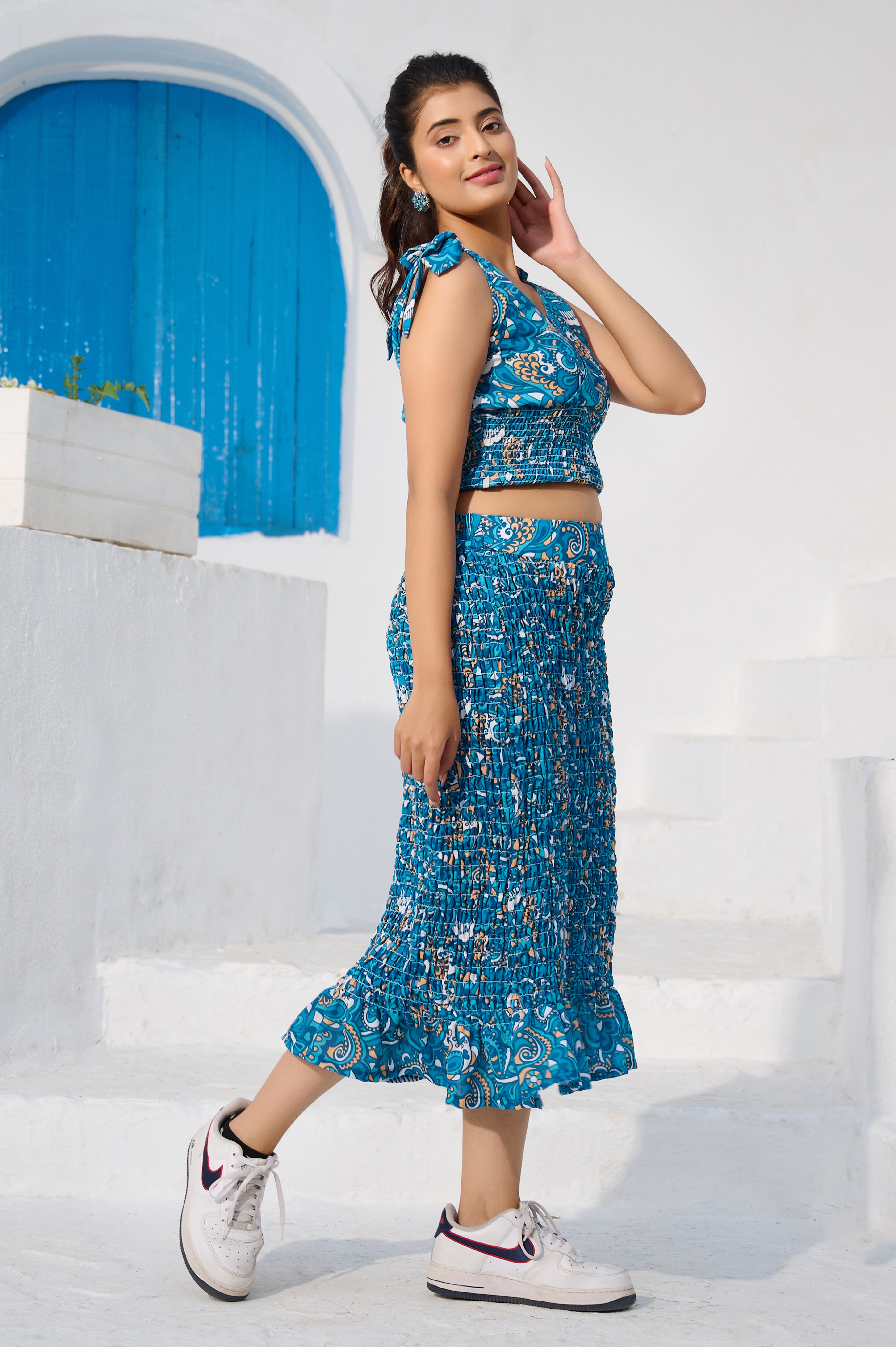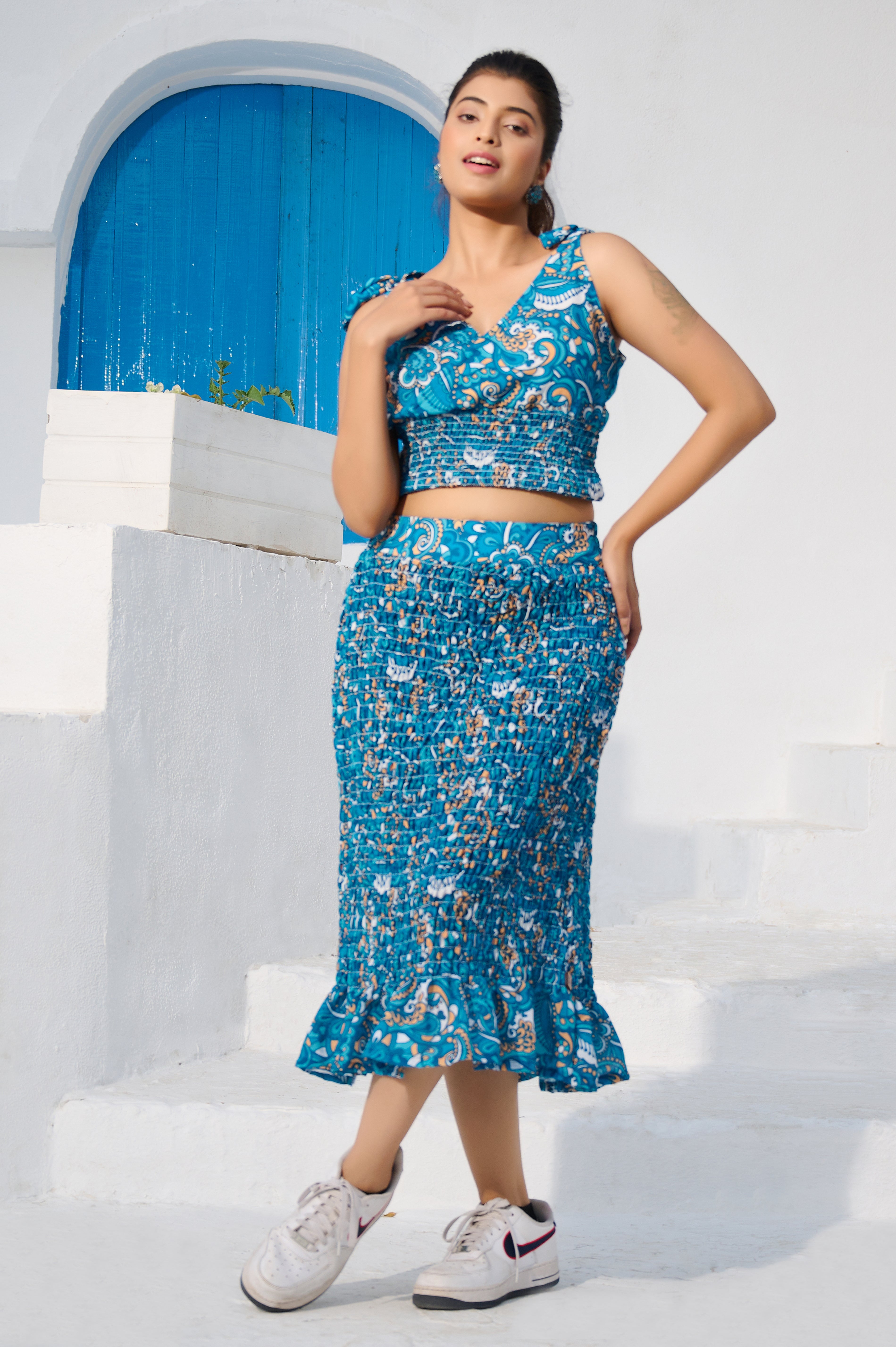 Elasticated Skirt and Top with Blazer Co-ord Set in Cotton Blend Blue fabric