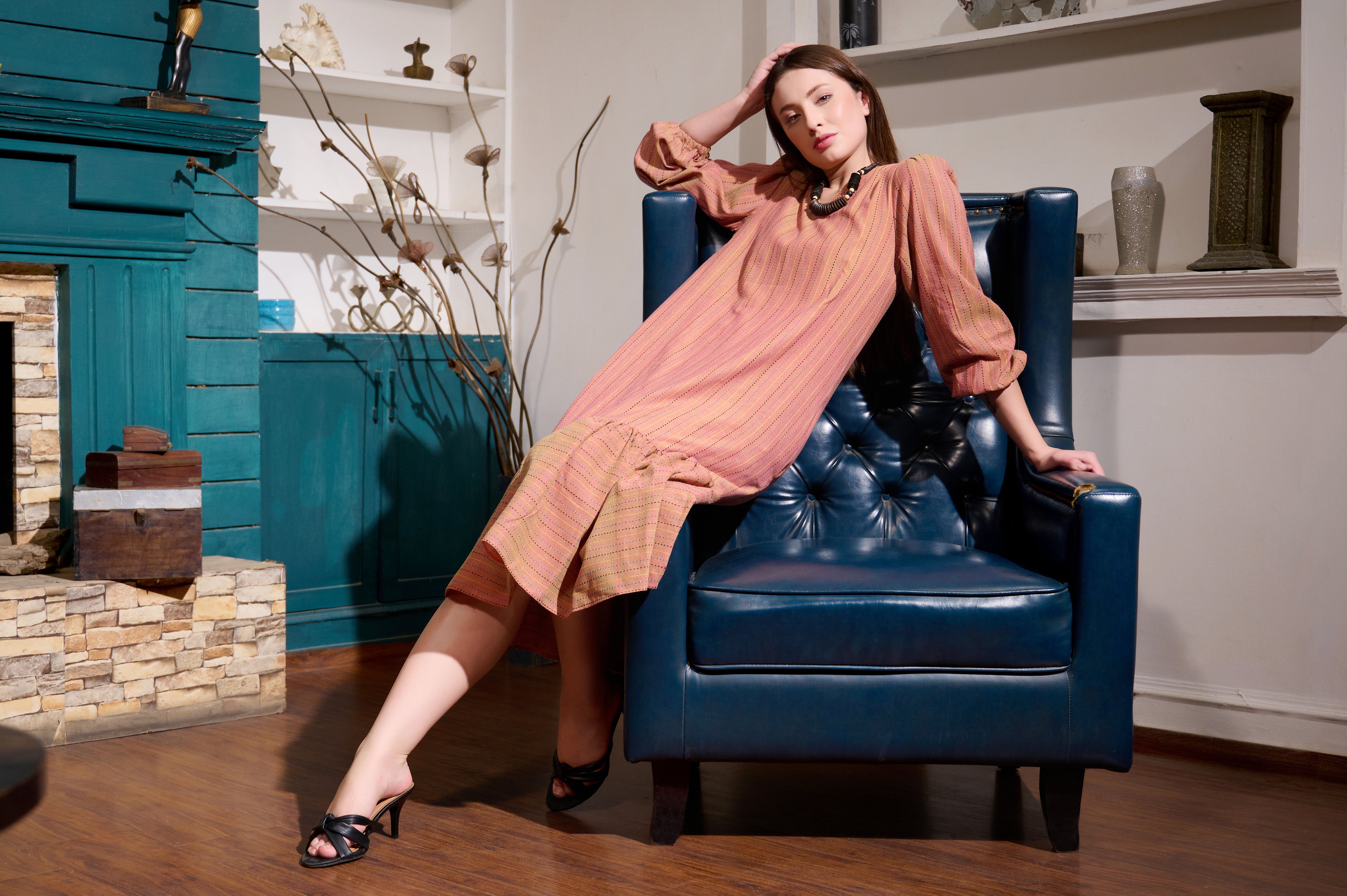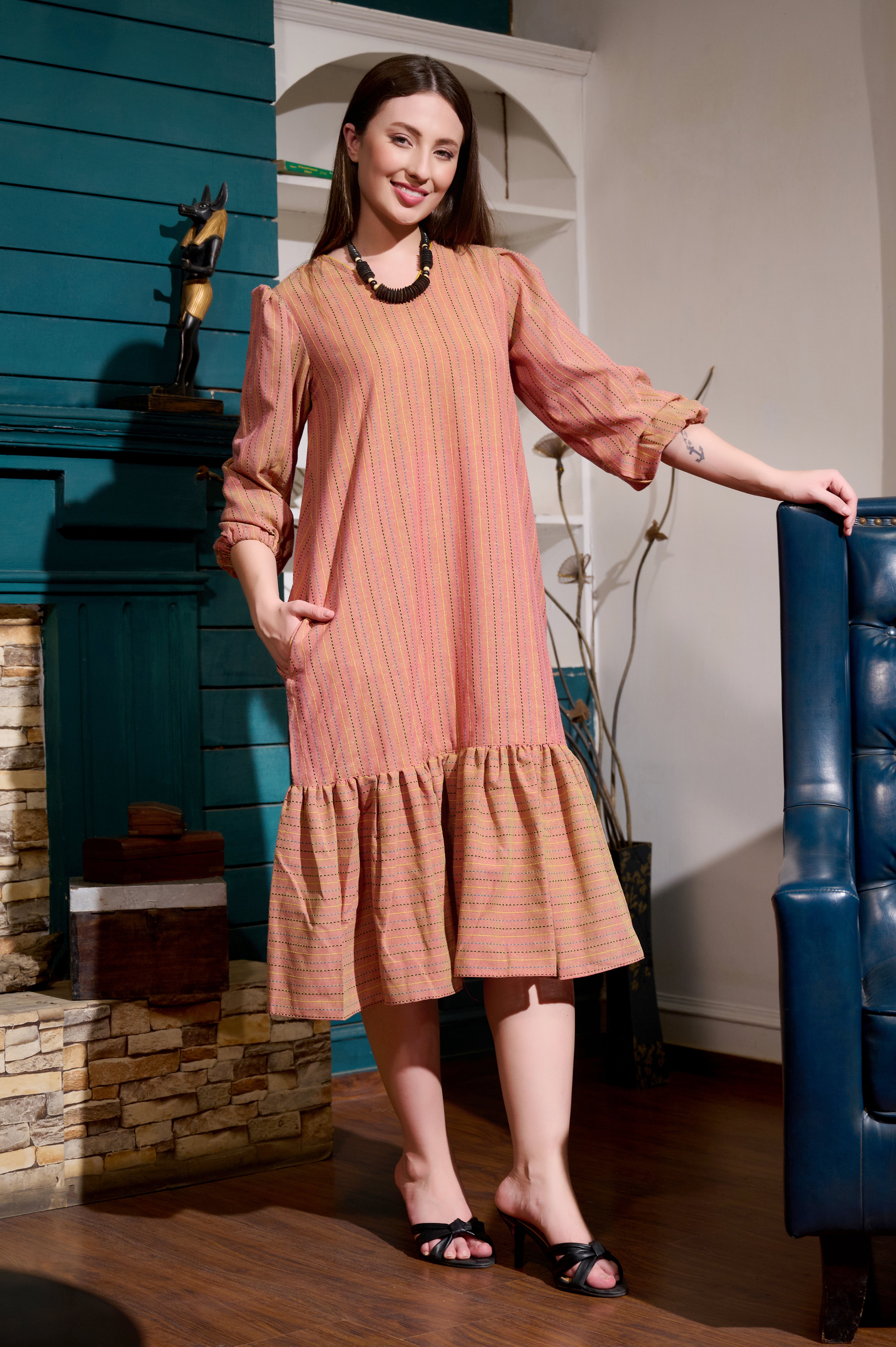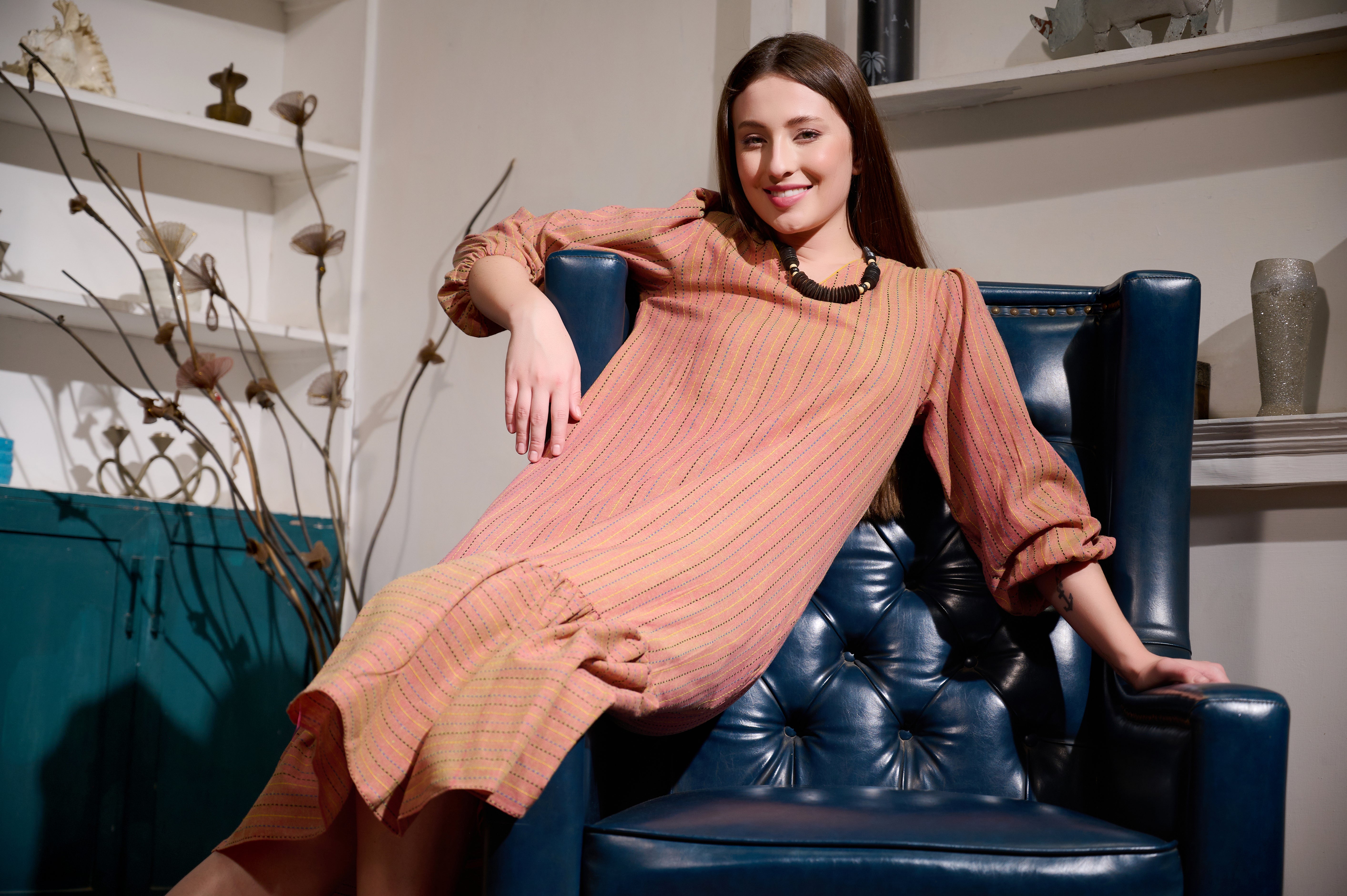 Embrace effortless elegance with our comfort frill dress, crafted from a premium cotton handloom fabric that ensures all-day comfort and breathability. This stunning dress features a dreamy stripes pattern, perfect for both casual outings and special occasions.