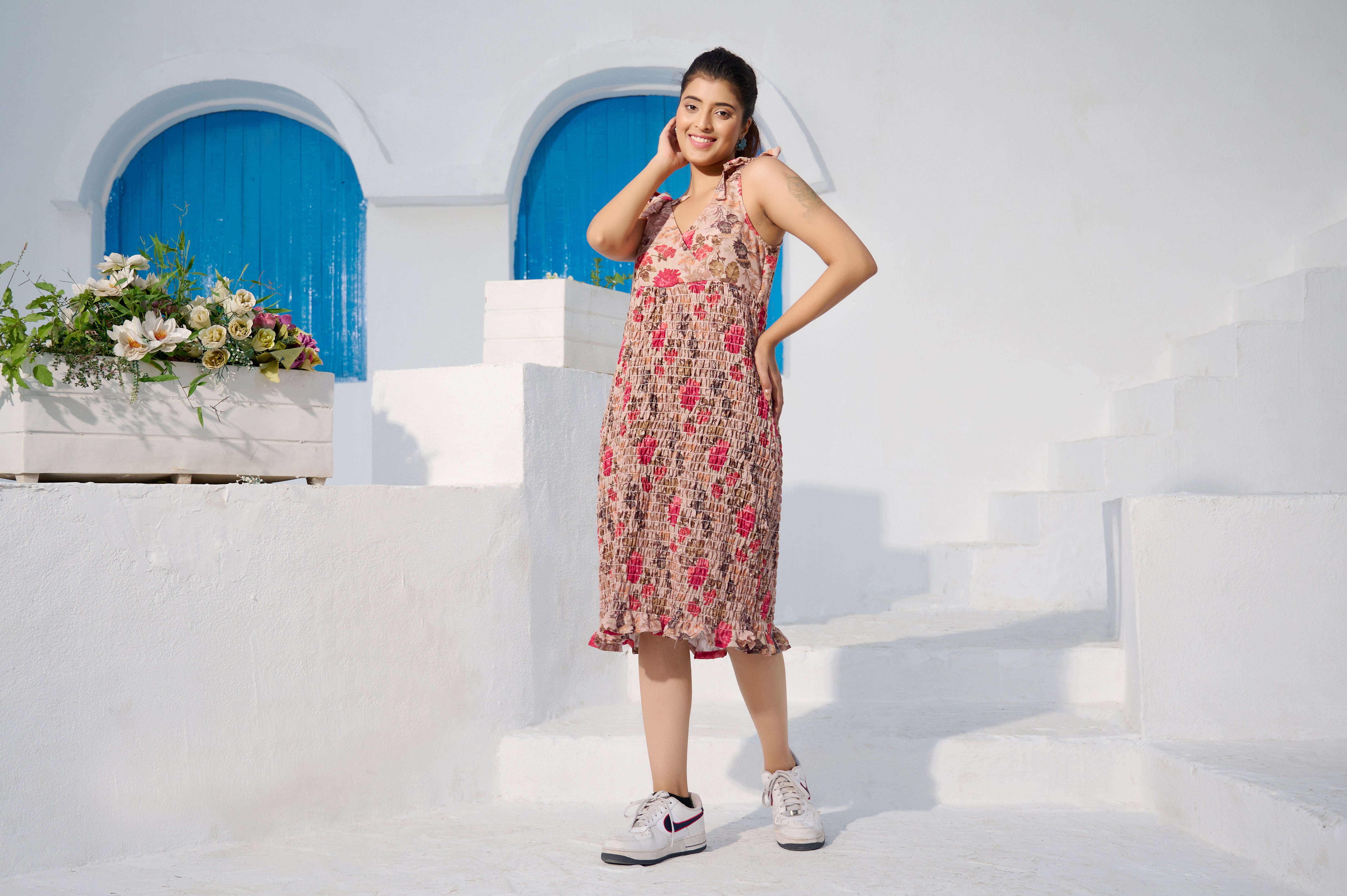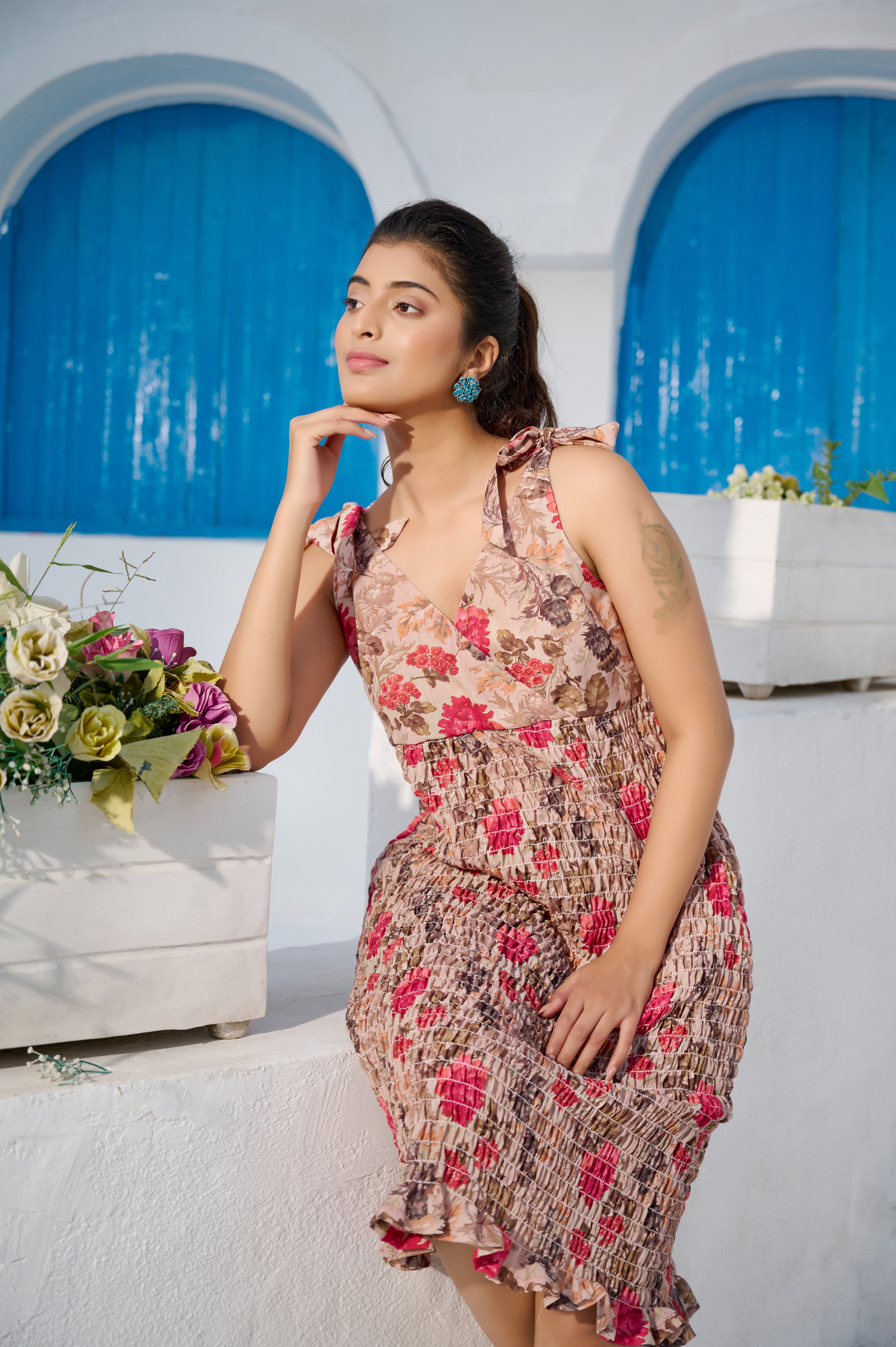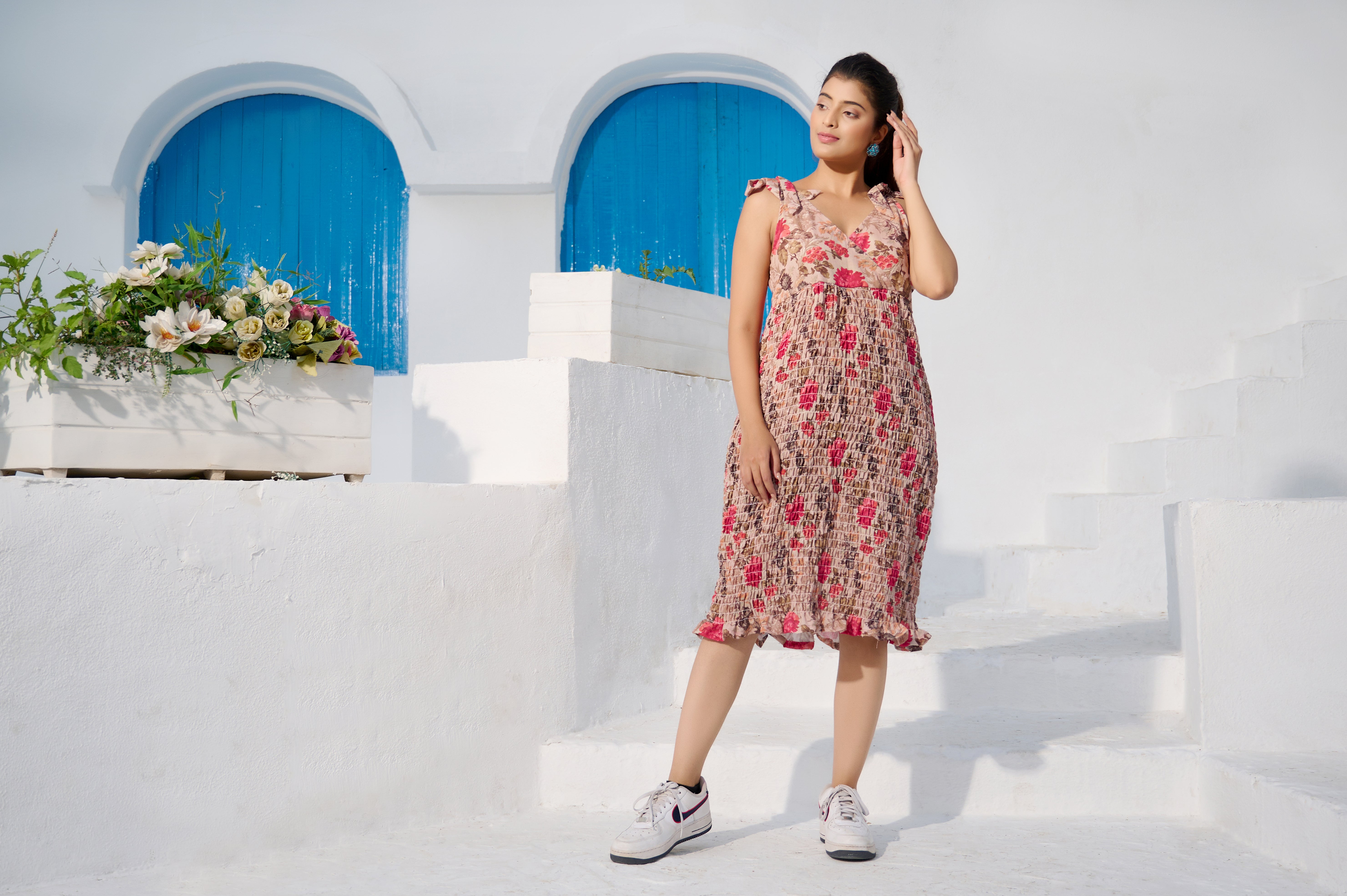 Tie top dress in Cotton Blend Brown Floral elasticated fabric